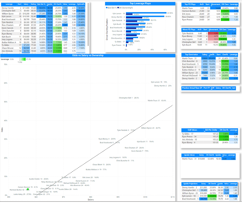 It seems that we have Larson with high odds and low ownership. WIthout knowing anything about the track, that is a situation I'll take blindly because its what my page is all about. Finding good leverage that others are leaving on the table. I see Bell and Cindric area also standouts, above the trend line as well. On the deep leverage side, theres a Carson Hocevar who looks mighty green. I dont know much about him but hes cheap so hopefully he doesnt stall out. I can tell by the upside and positioning that Hamlin is likely the favorite to win this so the Larson play will be interesting if we can get there.