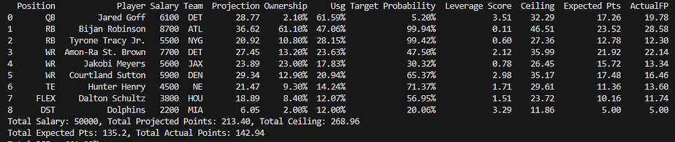 This is how the optimal came out for me, and its not horrible. Some positive ROI behind it, with both the top owned players in the lineup. Darnold stacked with WR1 and TE naturally and then Chuba Hubbard pivot at RB... not sure about that but just a thought based on what happened here.
