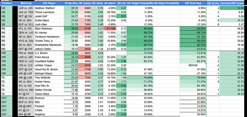 I underlined the top owned plays on the slate at each position and Bijan, while projecting top ownership as the top workload, he at least isn't the top priced. 61% is significant so we may have to see why that is the case (as I'm not sure yet), but my initial gut is to find other RBs at that level of ownership. Trever Lawrence is also extremely highly owned for the 2nd highest upside. Beneath him as pivots will be both Bo Nix and Matt Stafford, who seemingly have more points potential than they have shown in the past few weeks. The yellow line is where I try and find value left to right, so maybe Knox or one of the several TEs in that space can provide value. Luther Burden, Jawhar Jordan and Stevenson are the only non TEs in that area so its worth checking their situations today as well.