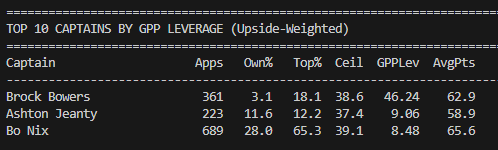 Bo Nix has some slight leverage at captain over flex spots but most captain leverage starts with Sutton, Dobbins and Franklin. Broncos DST has leverage in the flex, with Harvey, Lutz and Engram right behind. Those numbers may adjust as we get closer to lock. It should be noted that Bo Nix captain is expected to be the most popular on the slate and therefore I will not lock him in that spot as of now.